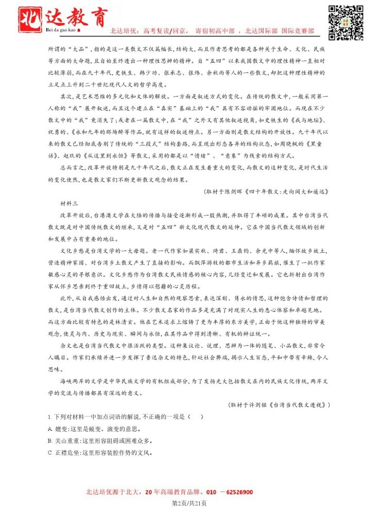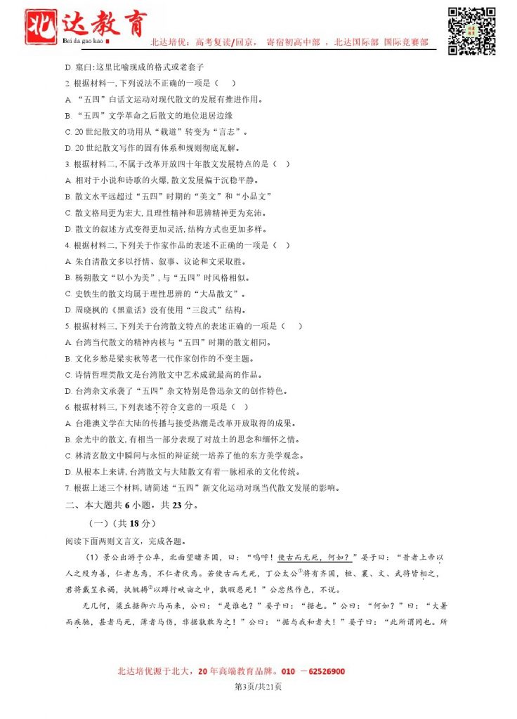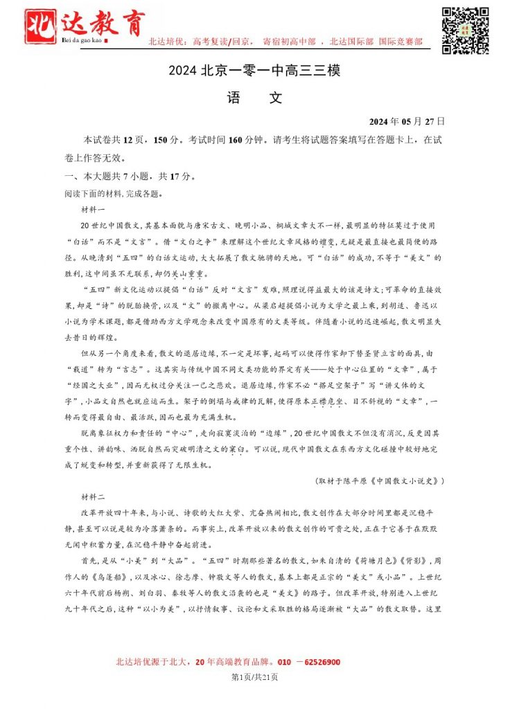 2024年北京各区高三三模陆续进行中,admw360教研组收集并整理了2024北京一零一中高三三模语文试卷含答案,分享给同学们。