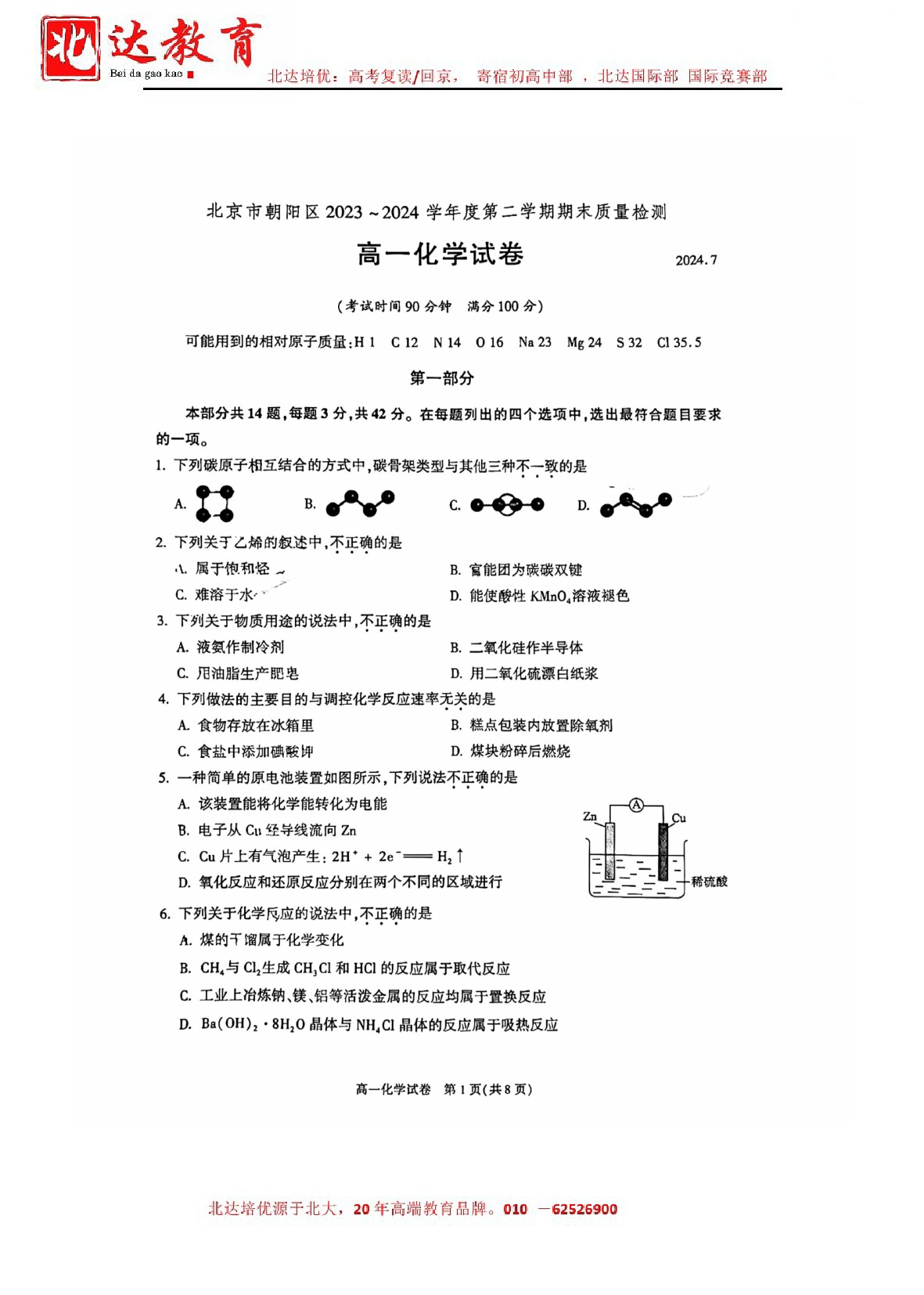 北京市2024高一下学期期末考试于7月初开考,为了方便同学们查找相关试题及答案,本文特意整理了2024北京朝阳高一(下)期末化学试卷含答案,详情如下: 导读推荐:2024北京各区高…