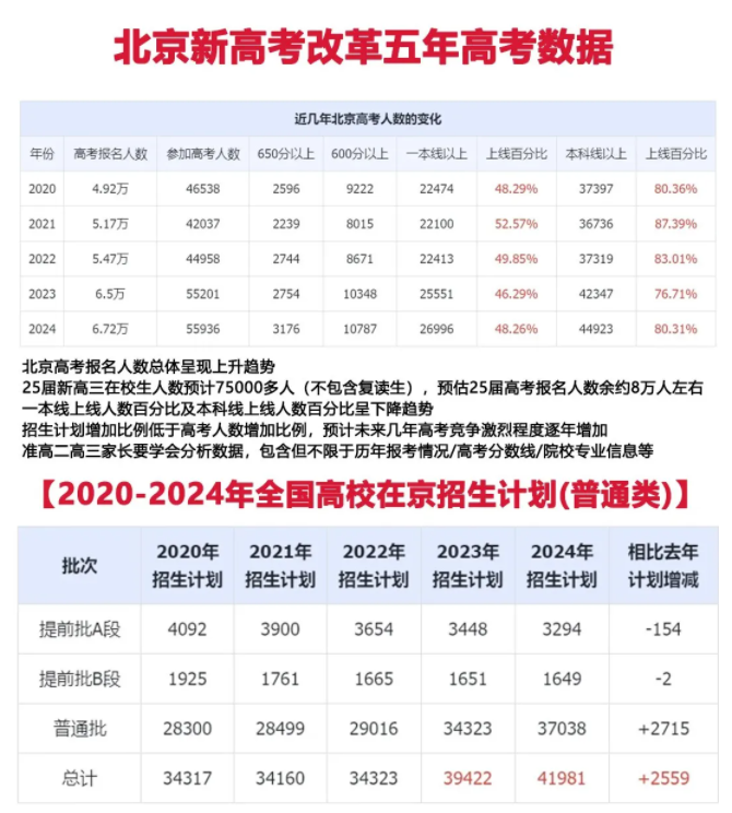 北京高考报名人数总体呈现上升趋势,25届新高三在校生人数预计75000多人(不包含复读生),预估25届高考报名人数余约8万人左右。