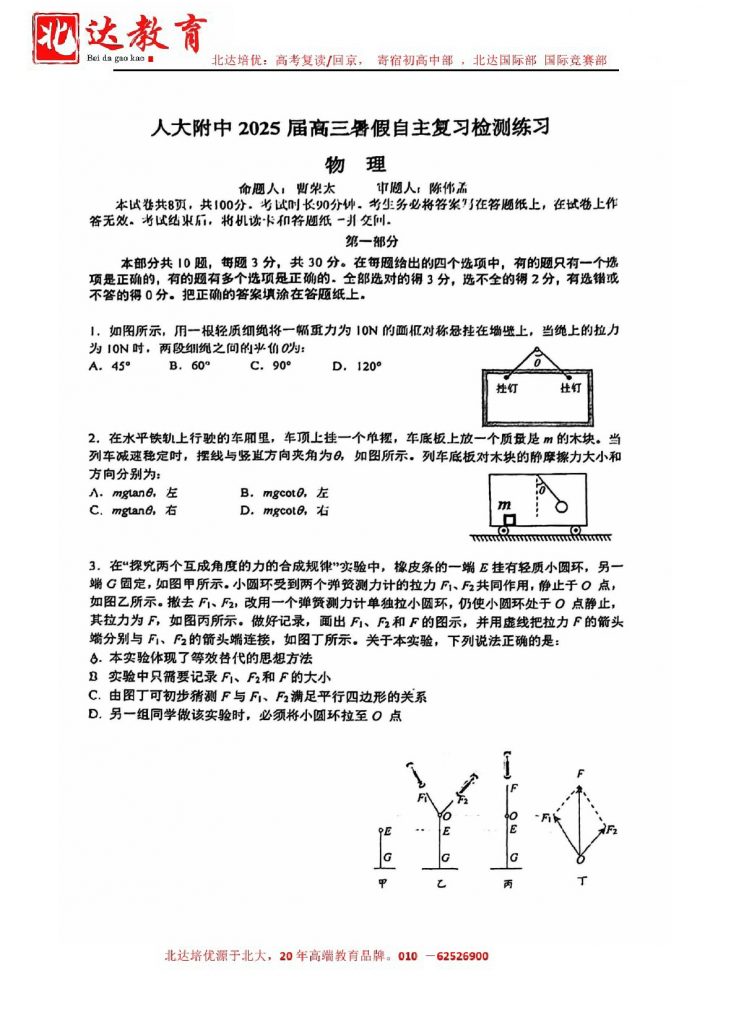 北京各中学新高三学生陆续进行开学考试,为此,本文特意整理了2024北京人大附中高三(上)开学考物理试题及答案,同学们可以点击链接下载PDF文件。 最新试题:2025北京各区各中学高…