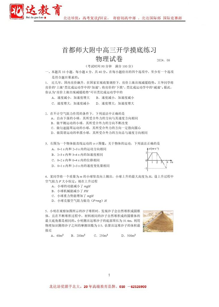 北京各中学新高三学生陆续进行开学考试,为此,本文特意整理了2024北京首都师大附中高三(上)开学考物理试题,同学们可以点击链接下载PDF文件。