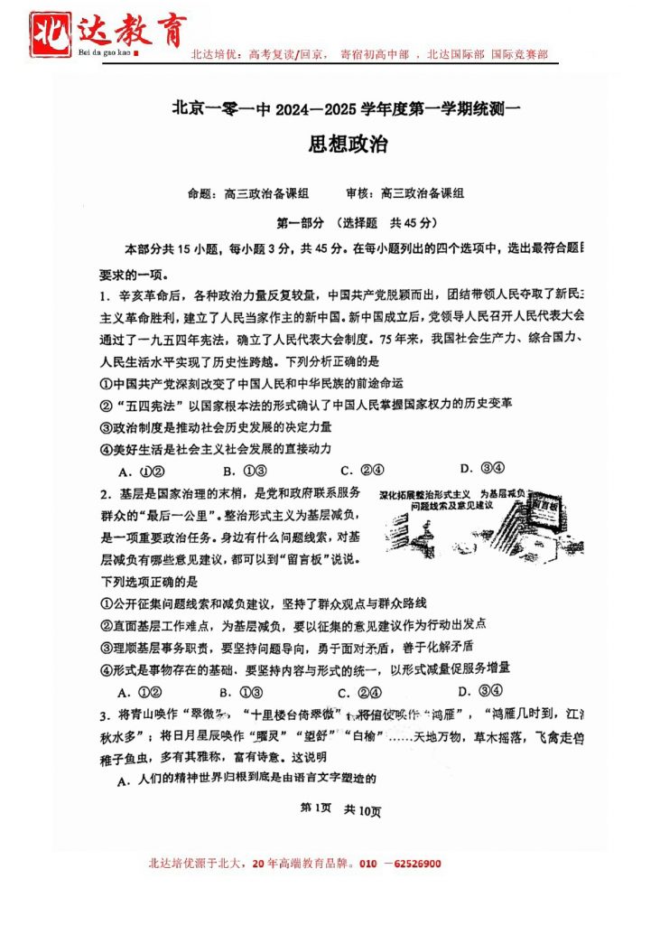 北京各中学新高三学生陆续进行开学考试,为此,本文特意整理了2024北京一零一中高三(上)开学考政治试题,同学们可以点击链接下载PDF文件。