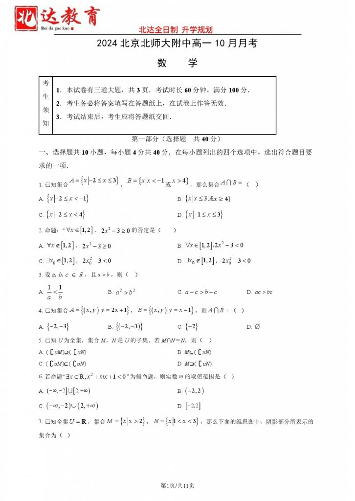 北京2024.10各个学校月考正在陆续进行中,为方便大家对答案、下载练习等小编给大家搜集了2024北京北师大附中高一10月月考数学试题及答案,需要的小伙伴赶紧下载练习起来吧: