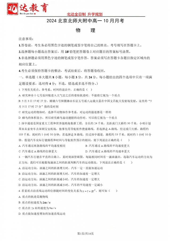 北京2024.10各个学校月考正在陆续进行中,为方便大家对答案、下载练习等小编给大家搜集了2024北京北师大附中高一10月月考物理试题及答案,需要的小伙伴赶紧下载练习起来吧: