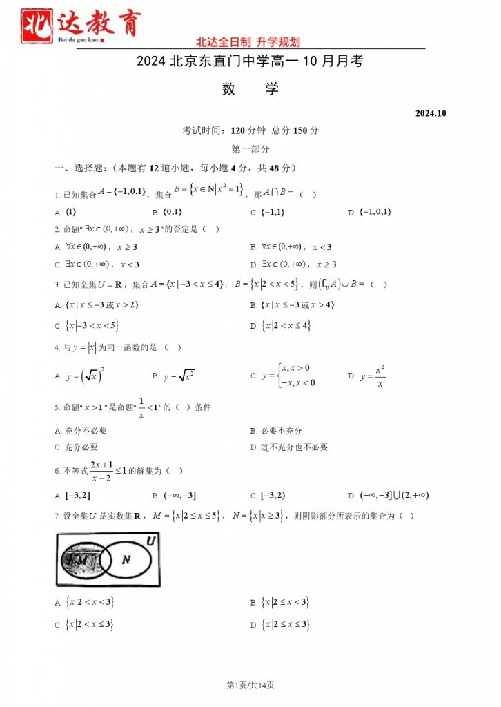 北京2024.10各个学校月考正在陆续进行中,为方便大家对答案、下载练习等小编给大家搜集了2024北京东直门中学高一10月月考数学试题及答案,需要的小伙伴赶紧下载练习起来吧: