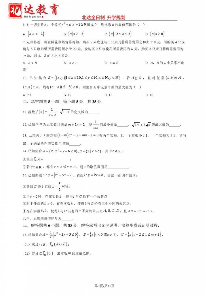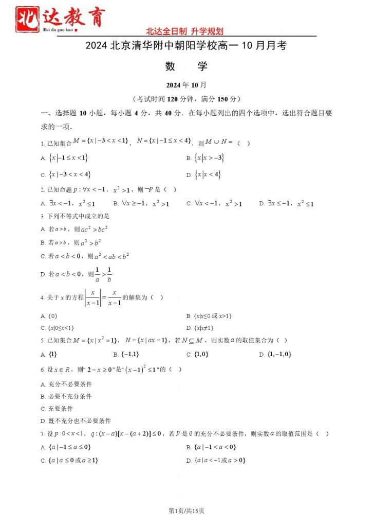 北京2024.10各个学校月考正在陆续进行中,为方便大家对答案、下载练习等小编给大家搜集了2024北京清华附中朝阳学校高一10月月考数学试题及答案,需要的小伙伴赶紧下载练习起来吧: