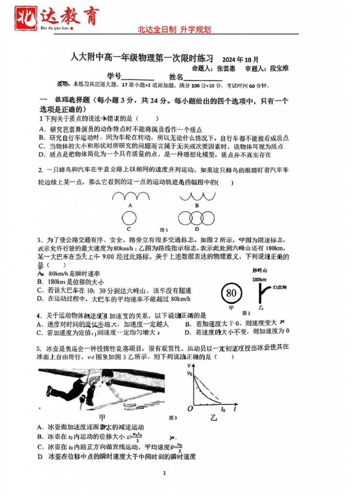 北京2024.10各个学校月考正在陆续进行中,为方便大家对答案、下载练习等小编给大家搜集了2024北京人大附中高一(上)第一次统练物理试题及答案,需要的小伙伴赶紧下载练习起来吧: