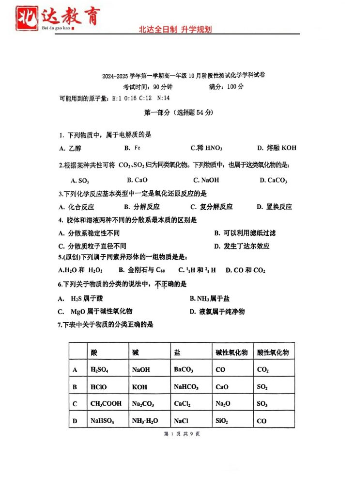 北京2024.10各个学校月考正在陆续进行中,为方便大家对答案、下载练习等小编给大家搜集了2024北京十一中高一10月月考化学试题及答案,需要的小伙伴赶紧下载练习起来吧: