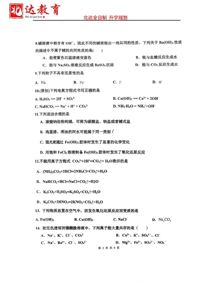 北京2024.10各个学校月考正在陆续进行中,为方便大家对答案、下载练习等小编给大家搜集了2024北京十一中高一10月月考化学试题及答案,需要的小伙伴赶紧下载练习起来吧: 试题预览…
