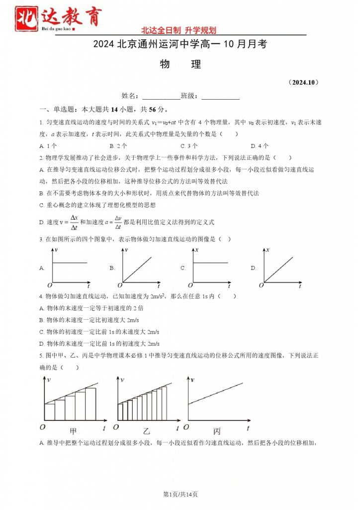 首页 高一资料 2024北京通州运河中学高一10月月考物理试题及答案