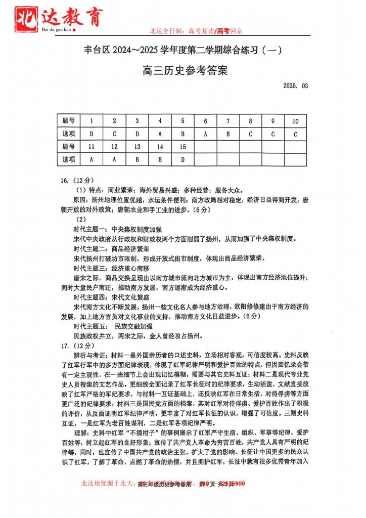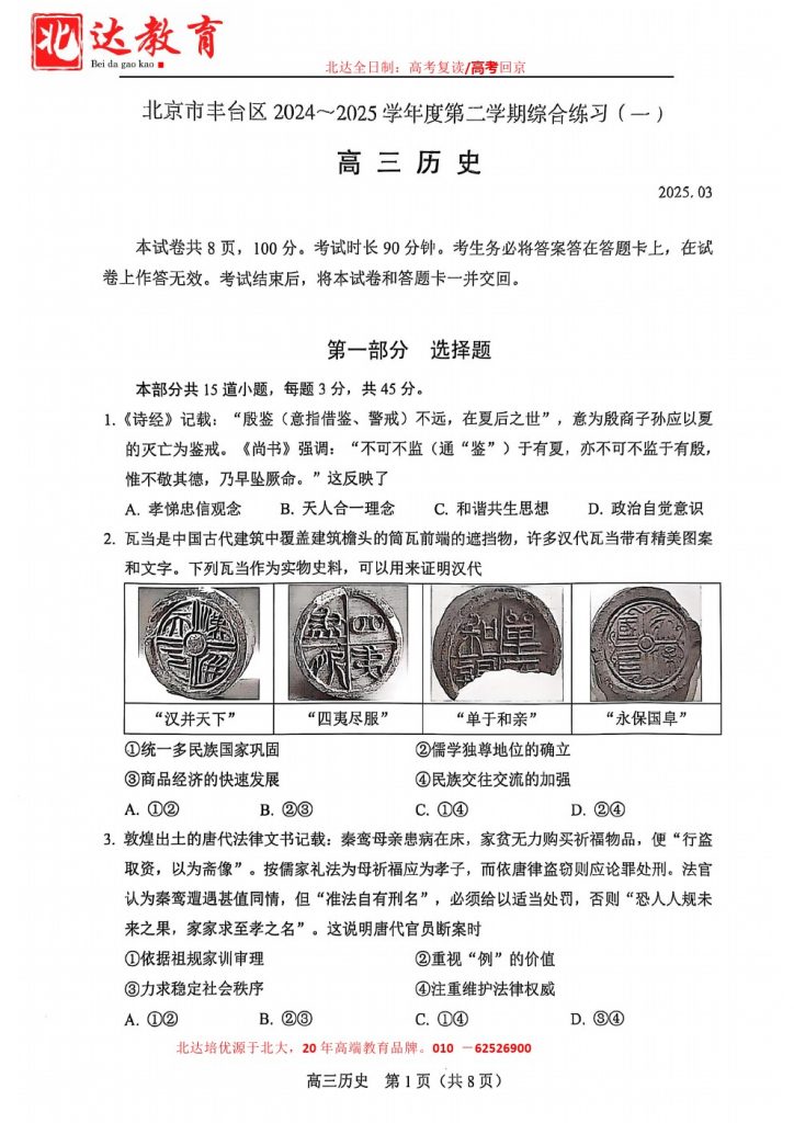 北京2025高三一模正在陆续进行中,为方便大家对答案、下载练习等小编给大家搜集了2025北京丰台区高三一模历史试题及答案,需要的小伙伴赶紧下载练习起来吧:
