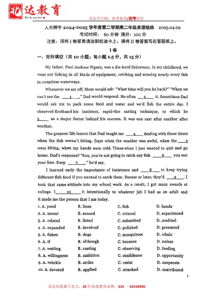为方便大家对答案、下载练习等小编给大家搜集了人大附中2025高二4月统练英语试题及答案,需要的小伙伴赶紧下载练习起来吧: