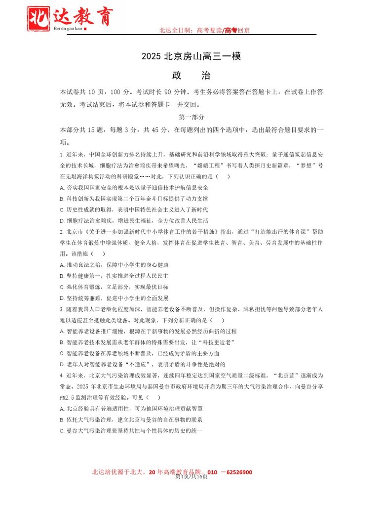 北京2025高三一模正在陆续进行中,为方便大家对答案、下载练习等小编给大家搜集了2025北京房山区高三一模政治试题及答案,需要的小伙伴赶紧下载练习起来吧: