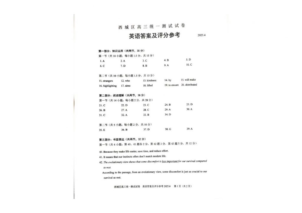 北京2025高三一模正在陆续进行中,为方便大家对答案、下载练习等小编给大家搜集了西城区2025高三一模英语试卷及答案,需要的小伙伴赶紧下载练习起来吧: