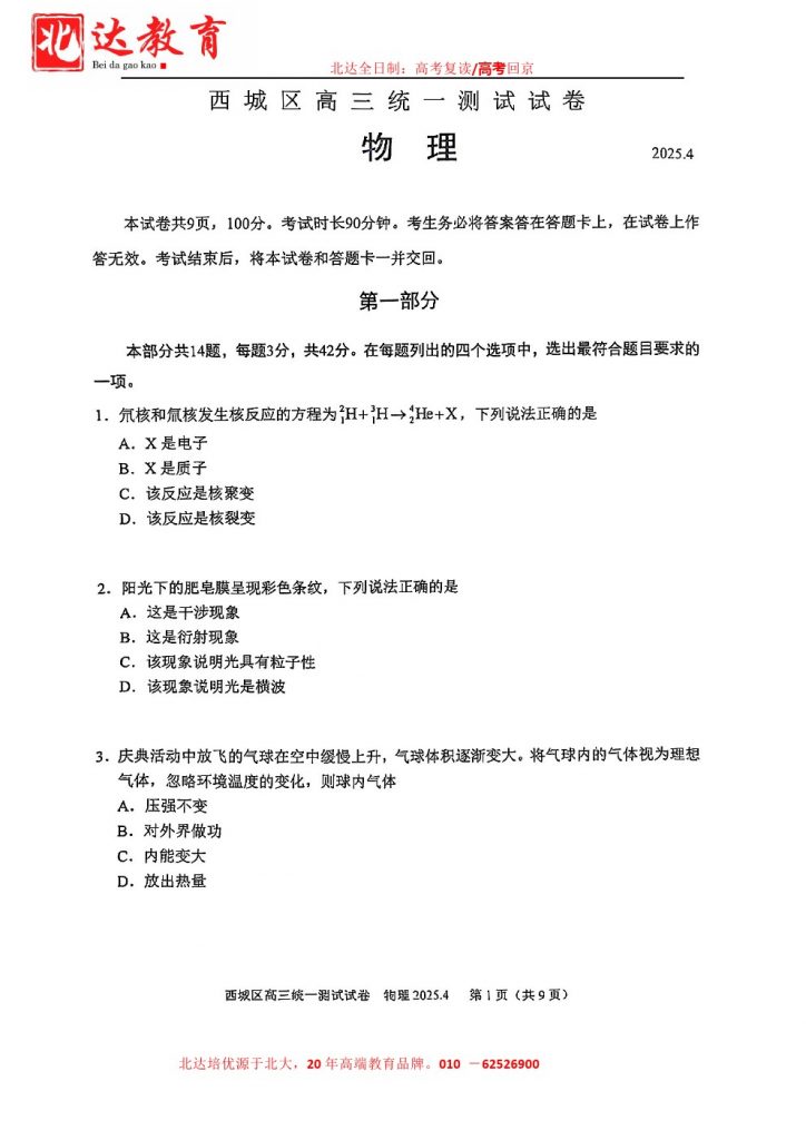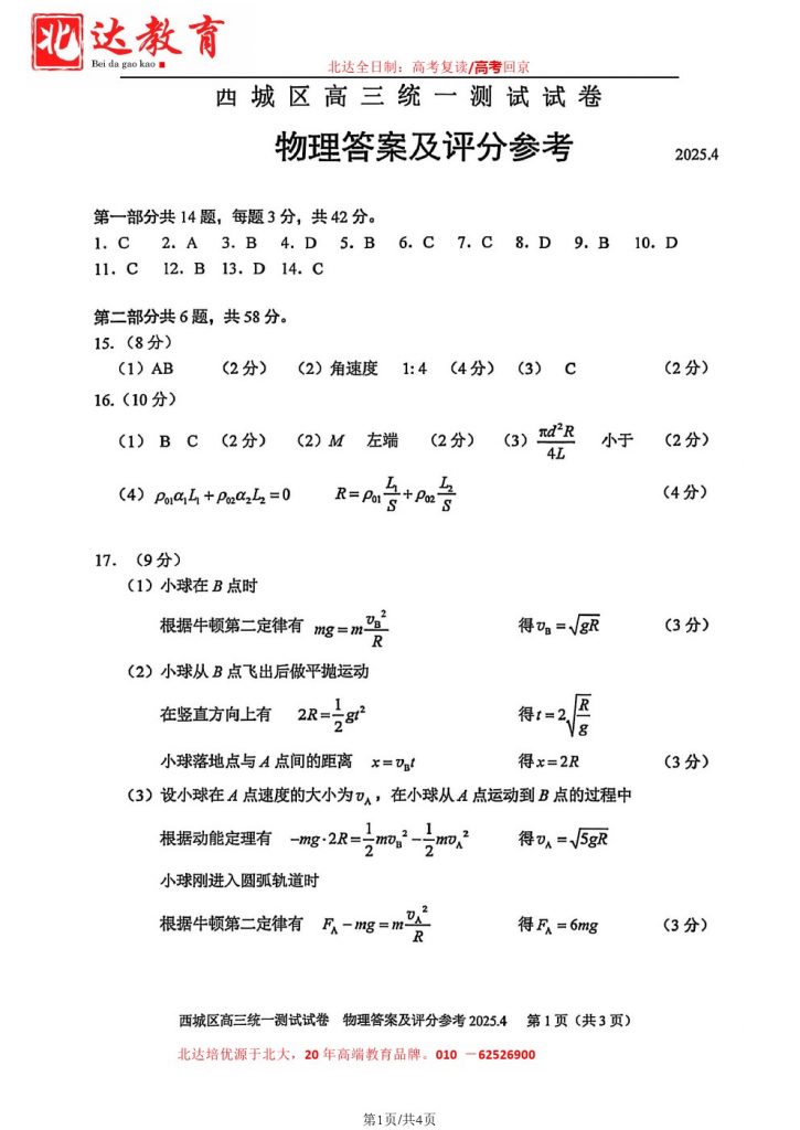 北京2025高三一模正在陆续进行中,为方便大家对答案、下载练习等小编给大家搜集了西城区2025高三一模物理试卷及答案,需要的小伙伴赶紧下载练习起来吧: