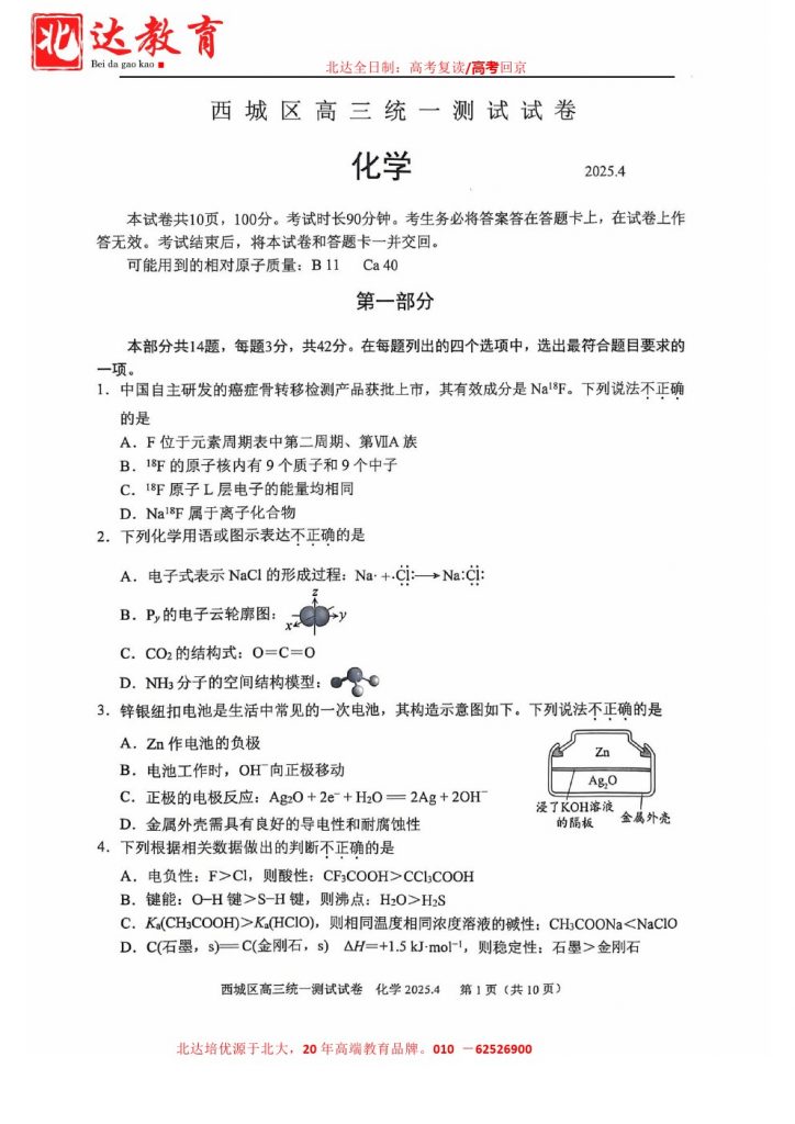 北京2025高三一模正在陆续进行中,为方便大家对答案、下载练习等小编给大家搜集了2025北京西城区高三一模化学试题及答案,需要的小伙伴赶紧下载练习起来吧: