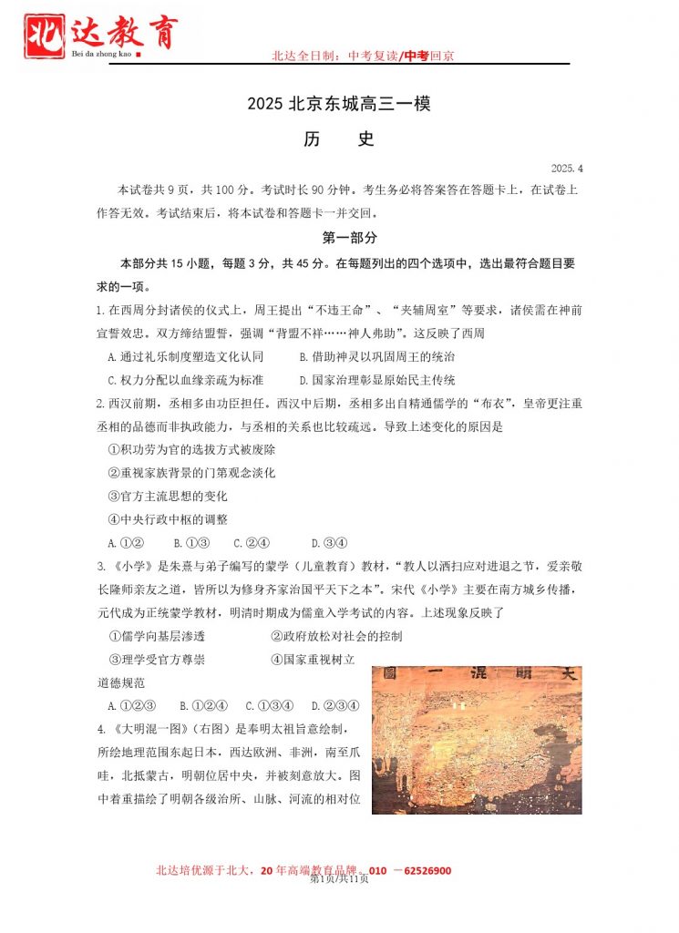 北京2025高三一模正在陆续进行中,为方便大家对答案、下载练习等小编给大家搜集了北京东城2025高三一模历史试题及答案,需要的小伙伴赶紧下载练习起来吧:
