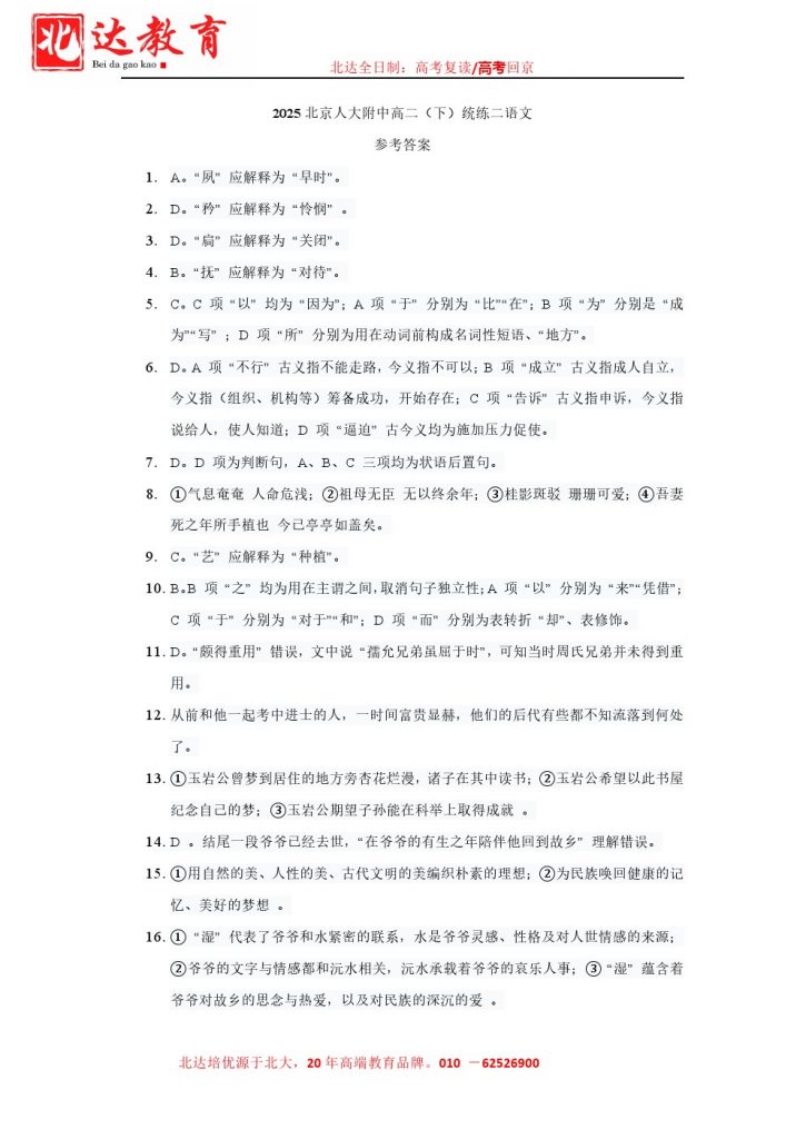 为方便大家对答案、下载练习等小编给大家搜集了人大附中2025高二(下)统练二语文试题及答案,需要的小伙伴赶紧下载练习起来吧: