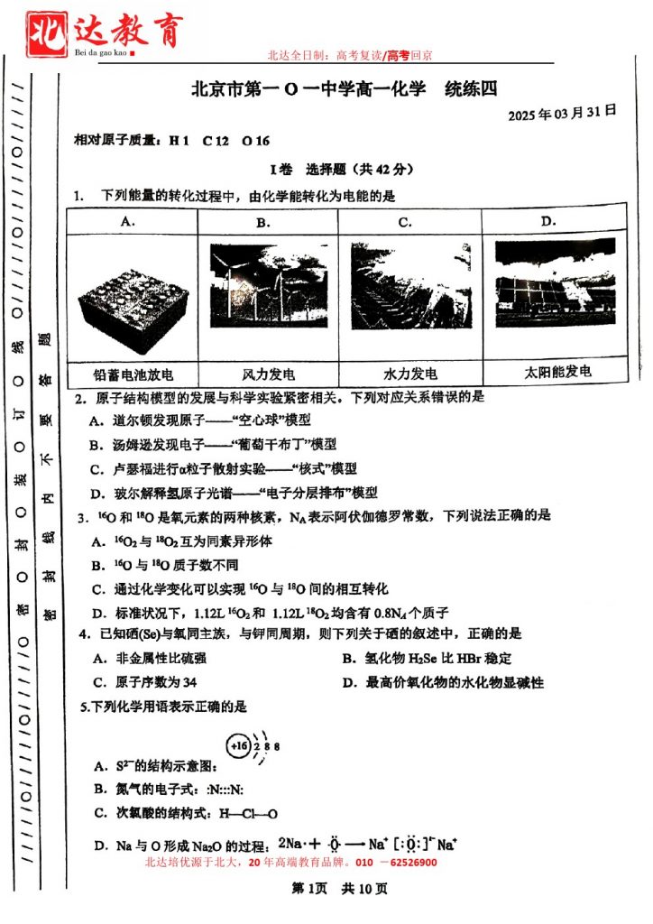为方便大家对答案、下载练习等小编给大家搜集了2025北京一零一中高一(下)统练四化学试题及答案,需要的小伙伴赶紧下载练习起来吧: