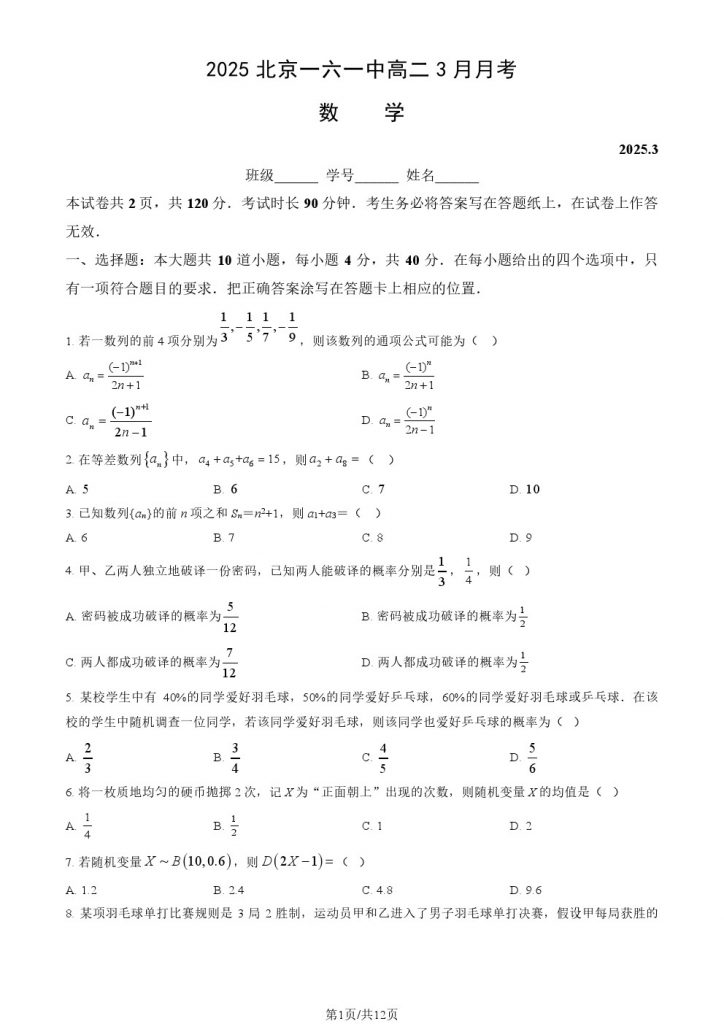 为方便大家对答案、下载练习等小编给大家搜集了2025北京一六一中高二3月月考数学试题及答案,需要的小伙伴赶紧下载练习起来吧: