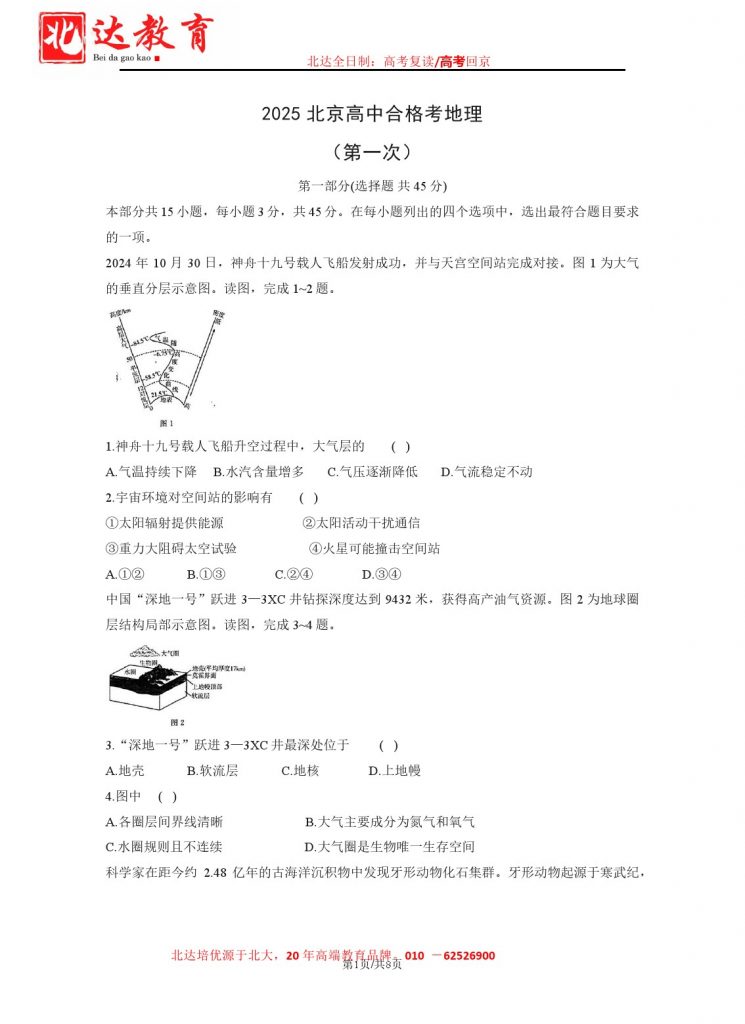 2025北京高中第一次合格考已结束,为了方便同学们了解各科试题情况,admw360教研组整理了2025北京高中第一次合格考地理试题及答案,需要的小伙伴赶紧下载练习起来吧: