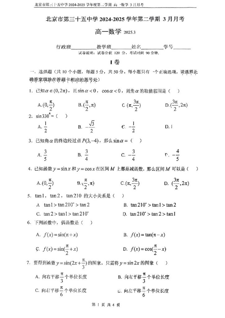 为方便大家对答案、下载练习等小编给大家搜集了2025北京三十五中高一3月月考数学试题,需要的小伙伴赶紧下载练习起来吧: