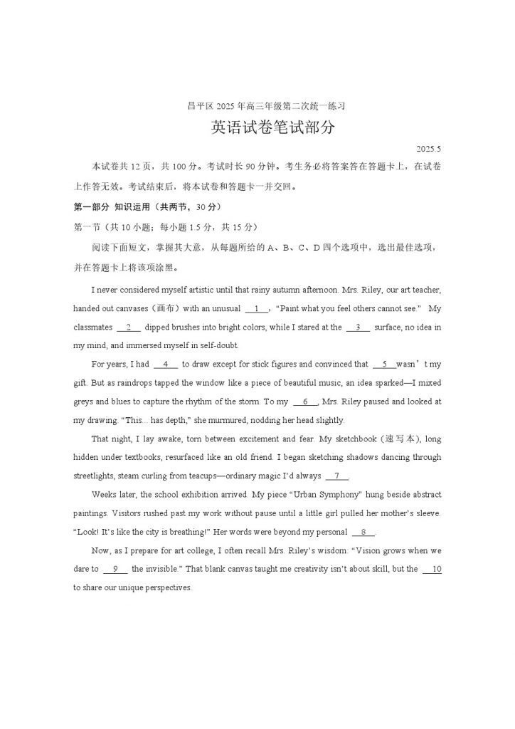 北京2025高三二模正在陆续进行中,为方便大家对答案、下载练习等,小编给大家搜集了北京昌平2025高三二模英语试题及答案,需要的小伙伴赶紧下载练习起来吧: