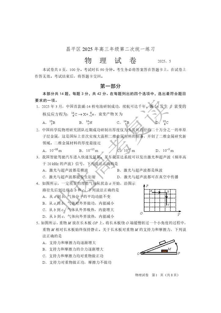 北京2025高三二模正在陆续进行中,为方便大家对答案、下载练习等,小编给大家搜集了北京昌平区2025高三二模物理试题及答案,需要的小伙伴赶紧下载练习起来吧:
