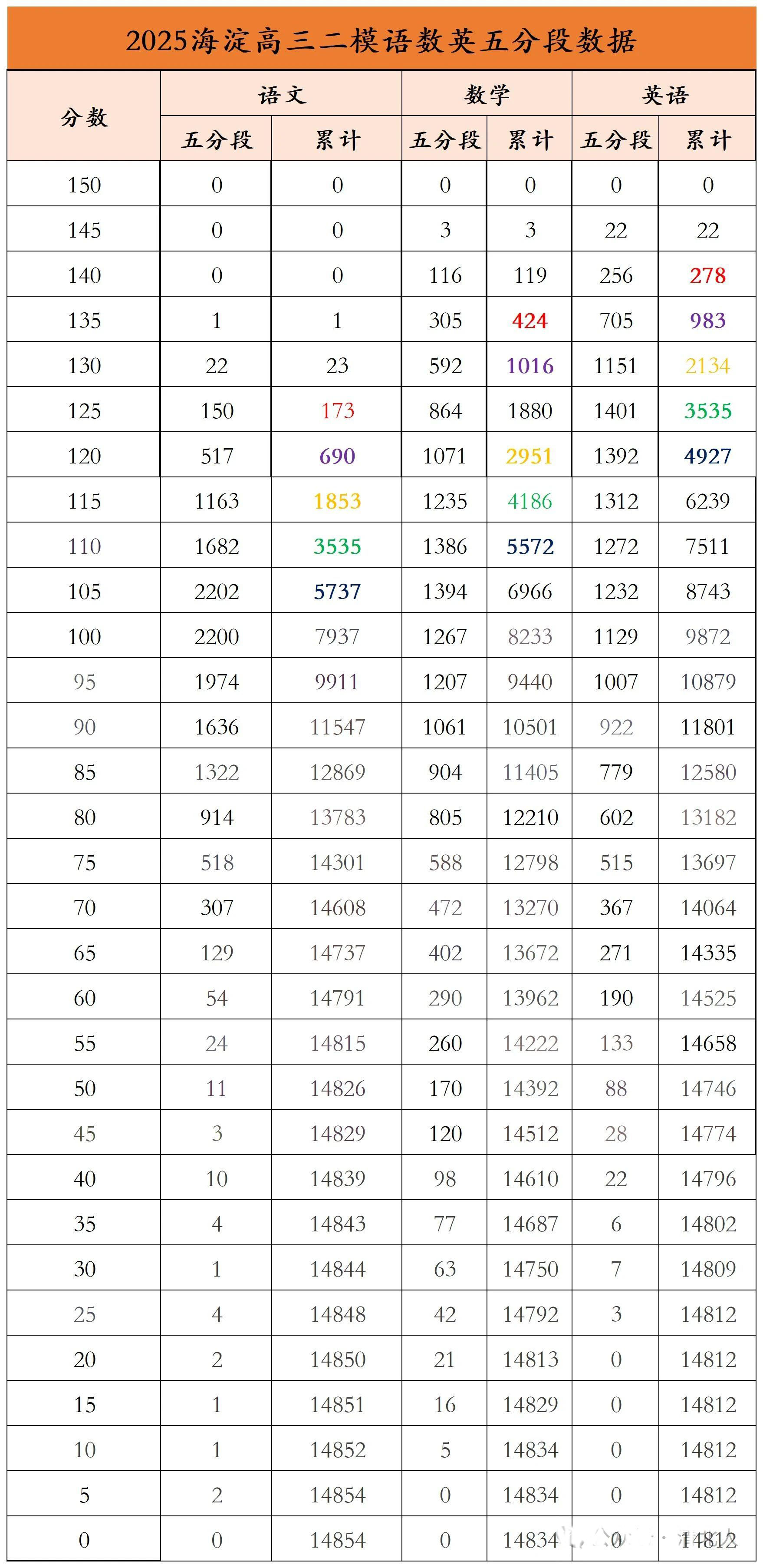 北京海淀区2025高三二模成绩排名出炉,admw360教研组为大家整理了2025海淀高三二模语数英五分段统计内容,分享给大家: 2025admw360高考复读全日制,应届生全日制,外地回京全日制采取择…
