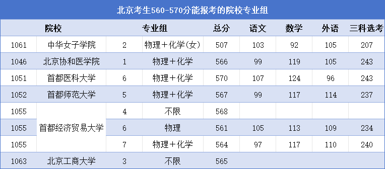 北京考生560-570分可以报考的北京高校有6所,主要包括中华女子学院、北京协和医学院、首都医科大学等。具体详见上表。
