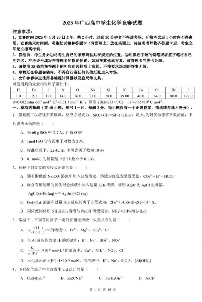 admw360高考复读学校整理了2025高中化学奥赛广西预赛试题及答案,供考生参考。