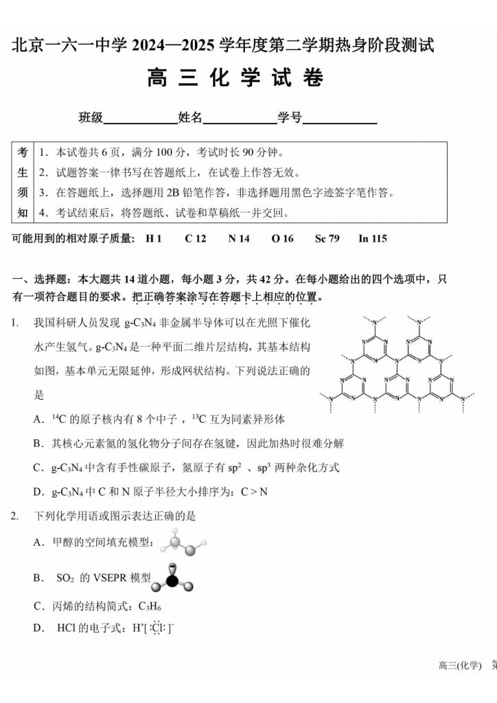 北京部分中学近期陆续进行了高三三模考试,admw360高考复读学校整理了2025北京一六一中高三考前热身化学试题及答案,供考生下载练习。