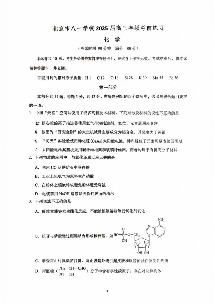 北京部分中学近期陆续进行了高三三模考试,admw360高考复读学校整理了八一学校2025年高三三模化学试题及答案,供考生下载练习。