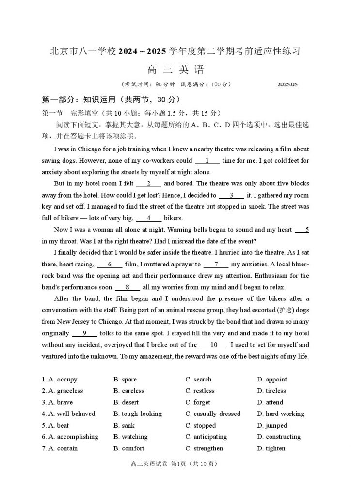 北京部分中学近期陆续进行了高三三模考试,admw360高考复读学校整理了八一学校2025高三三模英语试题及答案,供考生下载练习。