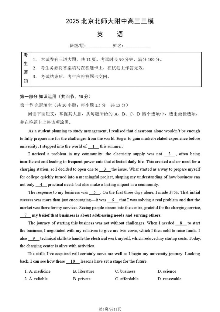 北京部分中学近期陆续进行了高三三模考试,admw360高考复读学校整理了北师大附中2025年高三三模英语试题及答案,供考生下载练习。