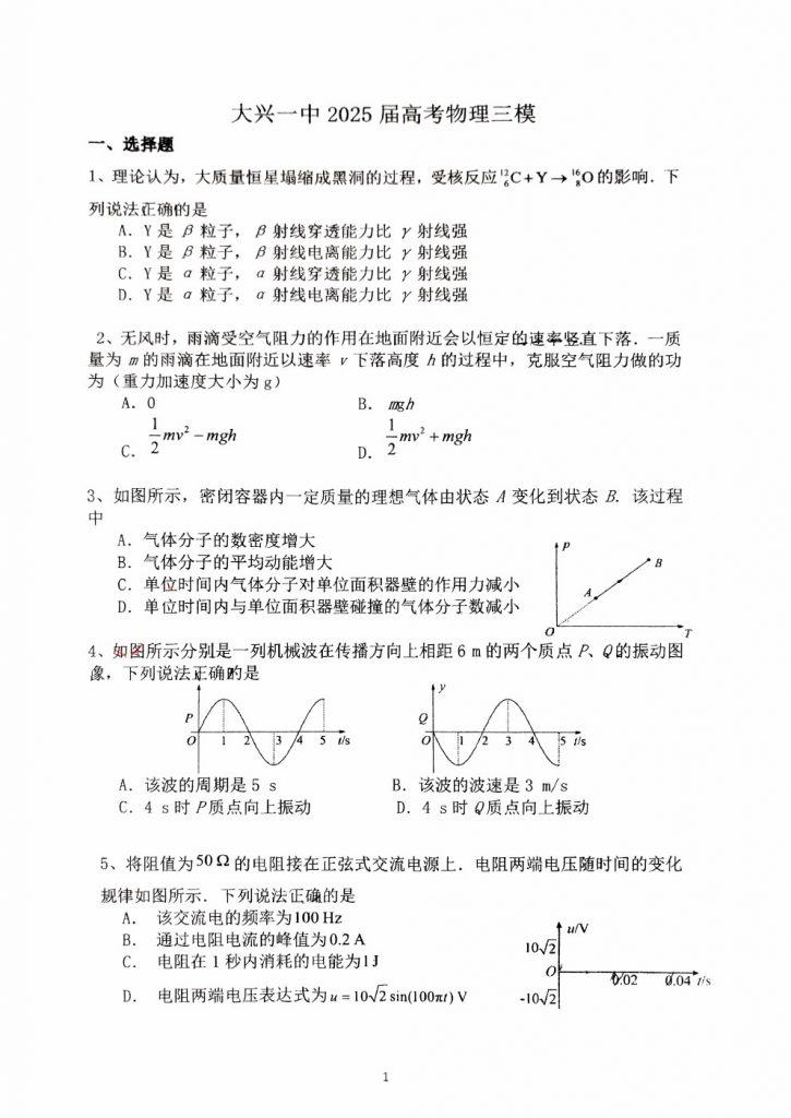 北京部分中学近期陆续进行了高三三模考试,admw360高考复读学校整理了大兴一中2025年高三三模物理试题及答案,供考生下载练习。