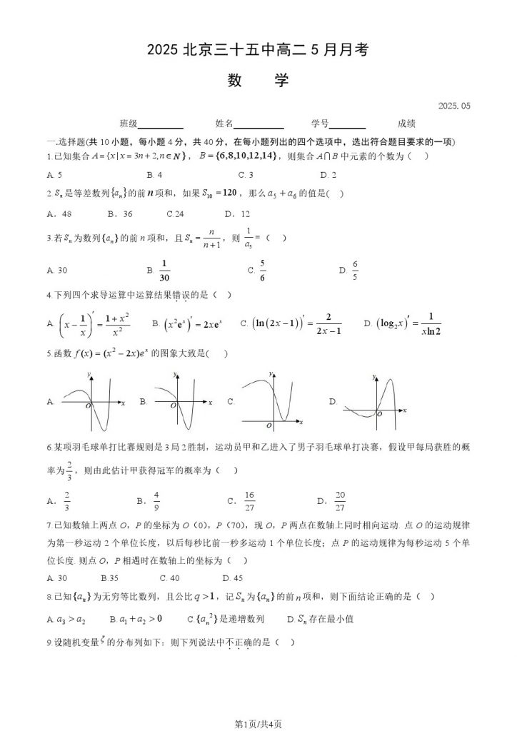 2025年北京各中学高二5月月考已结束,小编整理了北京三十五中2025年高二5月月考数学试题,分享给大家。