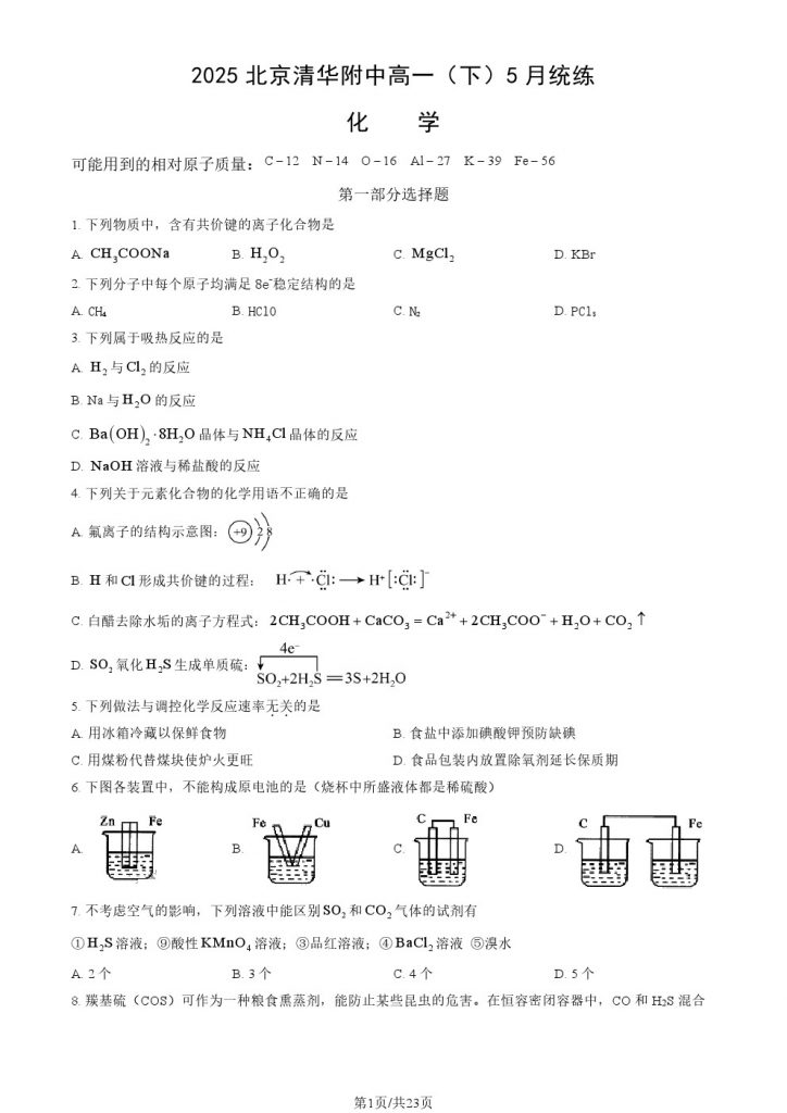 2025年北京各中学高一6月月考已结束,小编整理了清华附中2025高一(下)5月统练化学试题及答案,分享给大家。