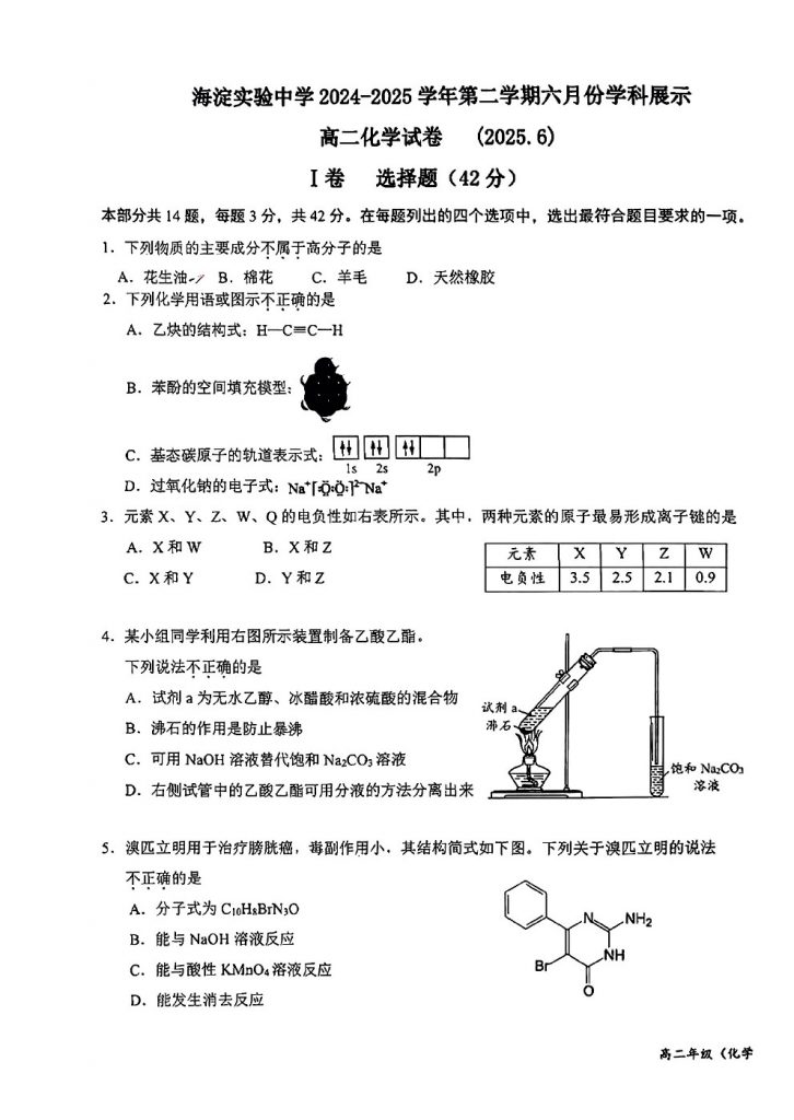 首页 高二资料 北京海淀实验中学2025年高二6月月考化学试题