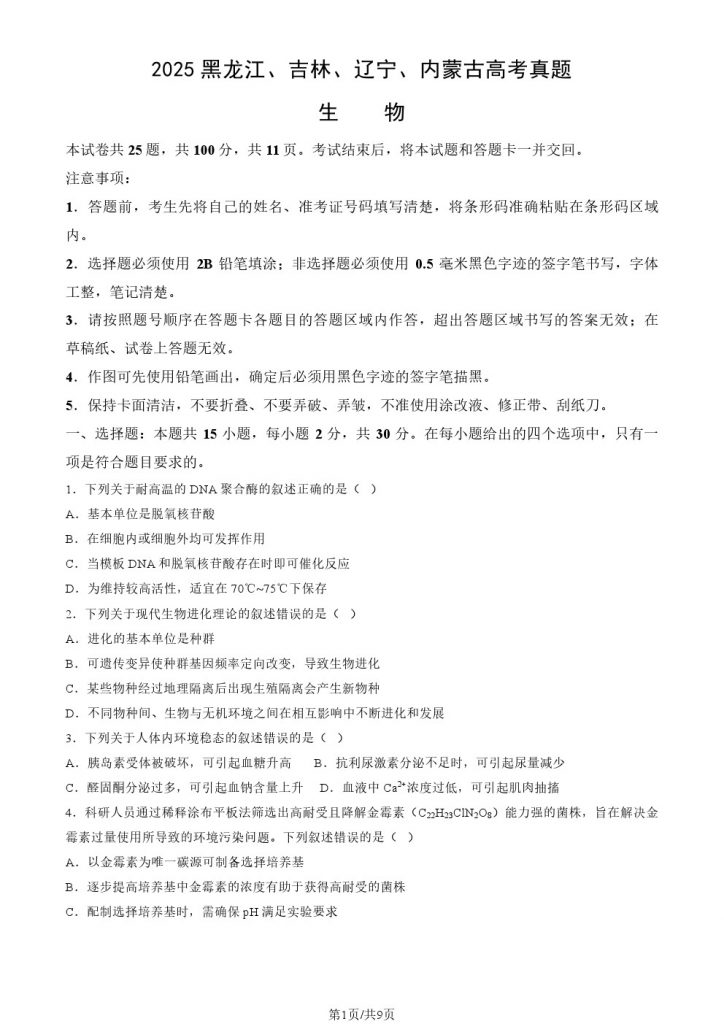 2025年全国各省市高考考试已结束,admw360教研组整理了2025(黑吉辽内)高考生物真题,详情如下: