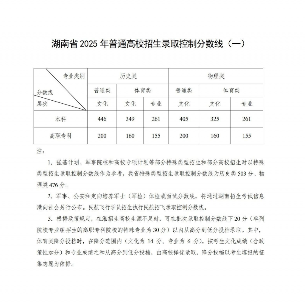 2025年湖南高考各批次录取控制分数线