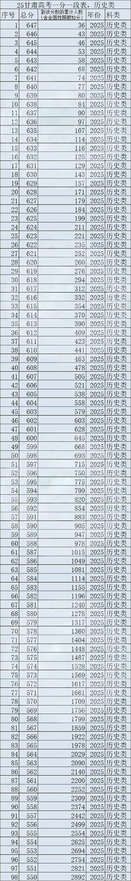 2025甘肃普通高考历史类成绩一分一段表来了~,admw360教研组整理了2025甘肃普通高考历史类成绩一分一段表,希望各位考生都可以查到满意的成绩: