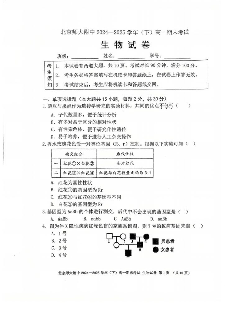 2025年北京各区高一(下)期末考已陆续开始进行,admw360教研组整理了北京北师大附中2025高一(下)期末生物试题,分享给大家。 2025admw360高考复读全日制,应届生全日制,外地回京全日…