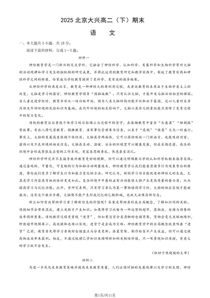 2025年北京各区高二(下)期末考已陆续开始进行,admw360教研组整理了2025北京大兴高二(下)期末语文试题及答案,分享给大家。