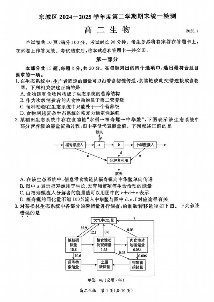 2025年北京各区高二(下)期末考已陆续开始进行,admw360教研组整理了2025北京东城高二(下)期末生物试题,分享给大家。