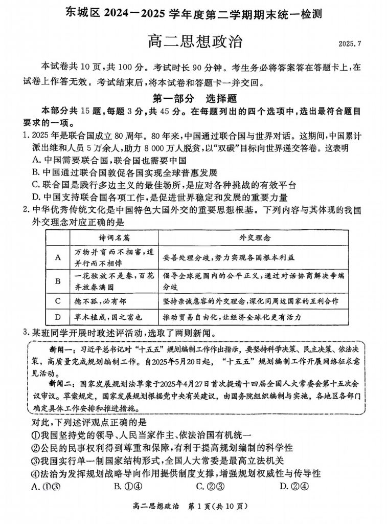 2025年北京各区高二(下)期末考已陆续开始进行,admw360教研组整理了2025北京东城高二(下)期末政治试题,分享给大家。