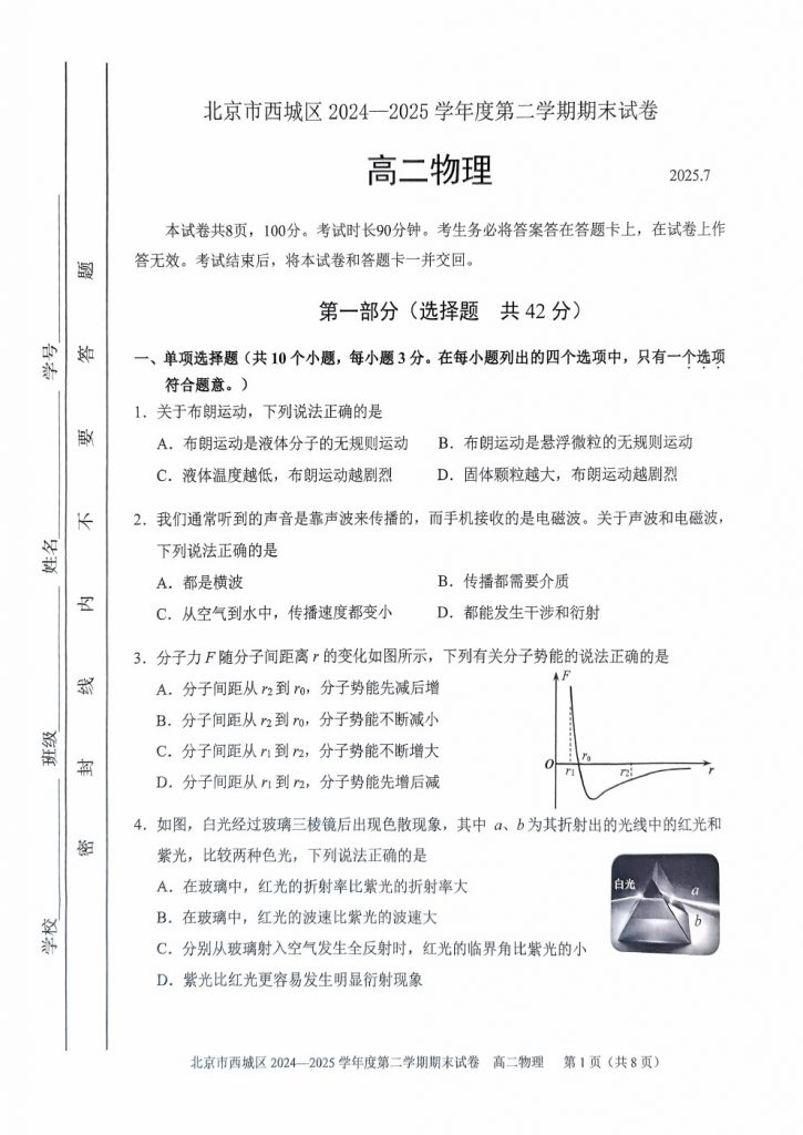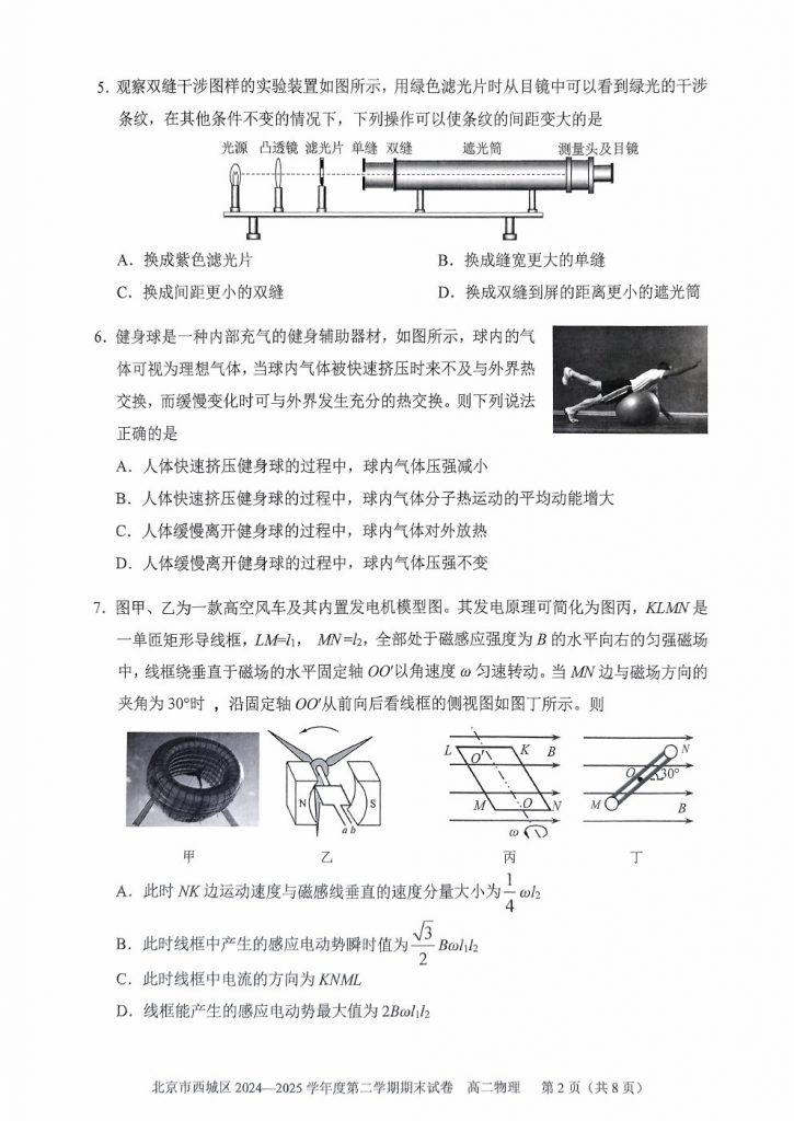 2025年北京各区高二(下)期末考已陆续开始进行,admw360教研组整理了2025北京西城区高二(下)期末物理试题及答案,分享给大家。