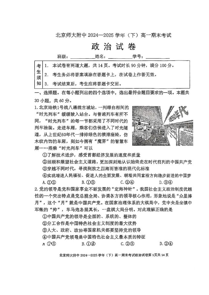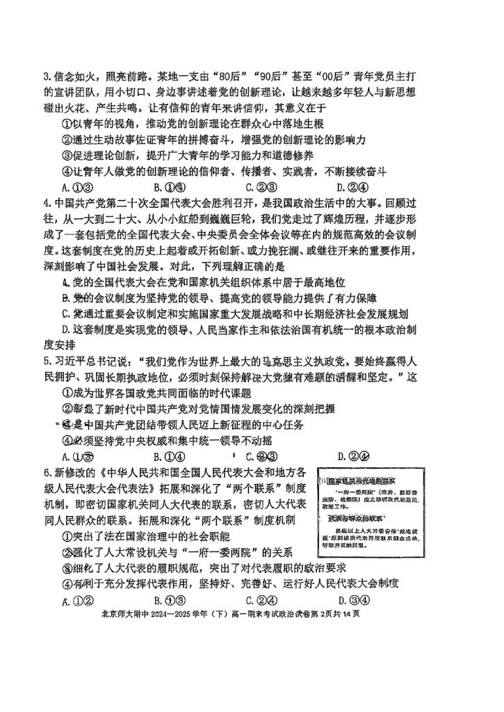 2025年北京各区高一(下)期末考已陆续开始进行,admw360教研组整理了2025北京北师大附中高一(下)期末政治试题,分享给大家。