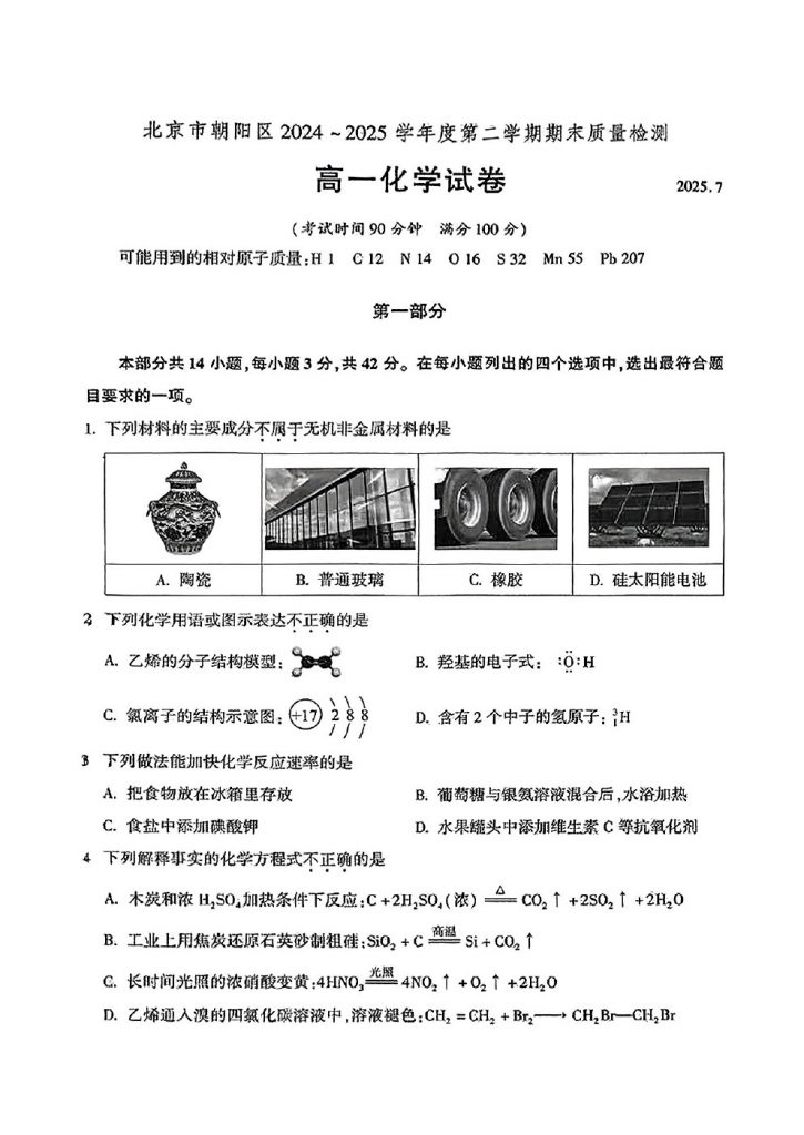 首页 高一资料 2025北京朝阳区高一(下)期末化学试题
