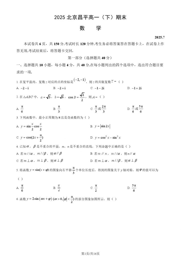2025年北京各区高一(下)期末考已陆续开始进行,admw360教研组整理了2025北京昌平高一(下)期末数学试题及答案,分享给大家。